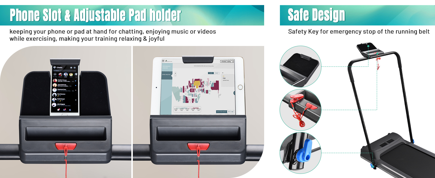 • [Convenient & Safe Design]: features phone slot & adjustable Pad holder for keeping your phone or pad at hand for chatting, enjoying music or videos while exercising, making your training relaxing & joyful; Safety Key for emergency stop of the running belt to avoid accidents