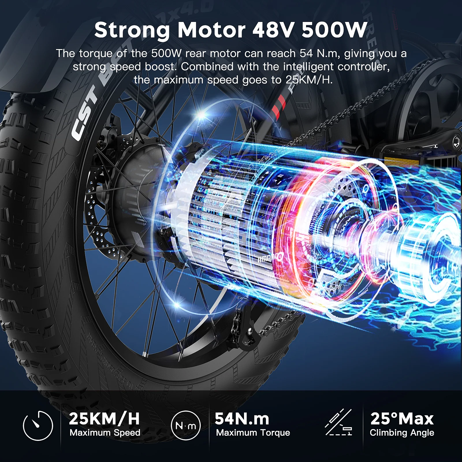 The 500W brushless motor with a maximum torque of 54Nm combined with intelligent control produces a top speed of 25km/h.