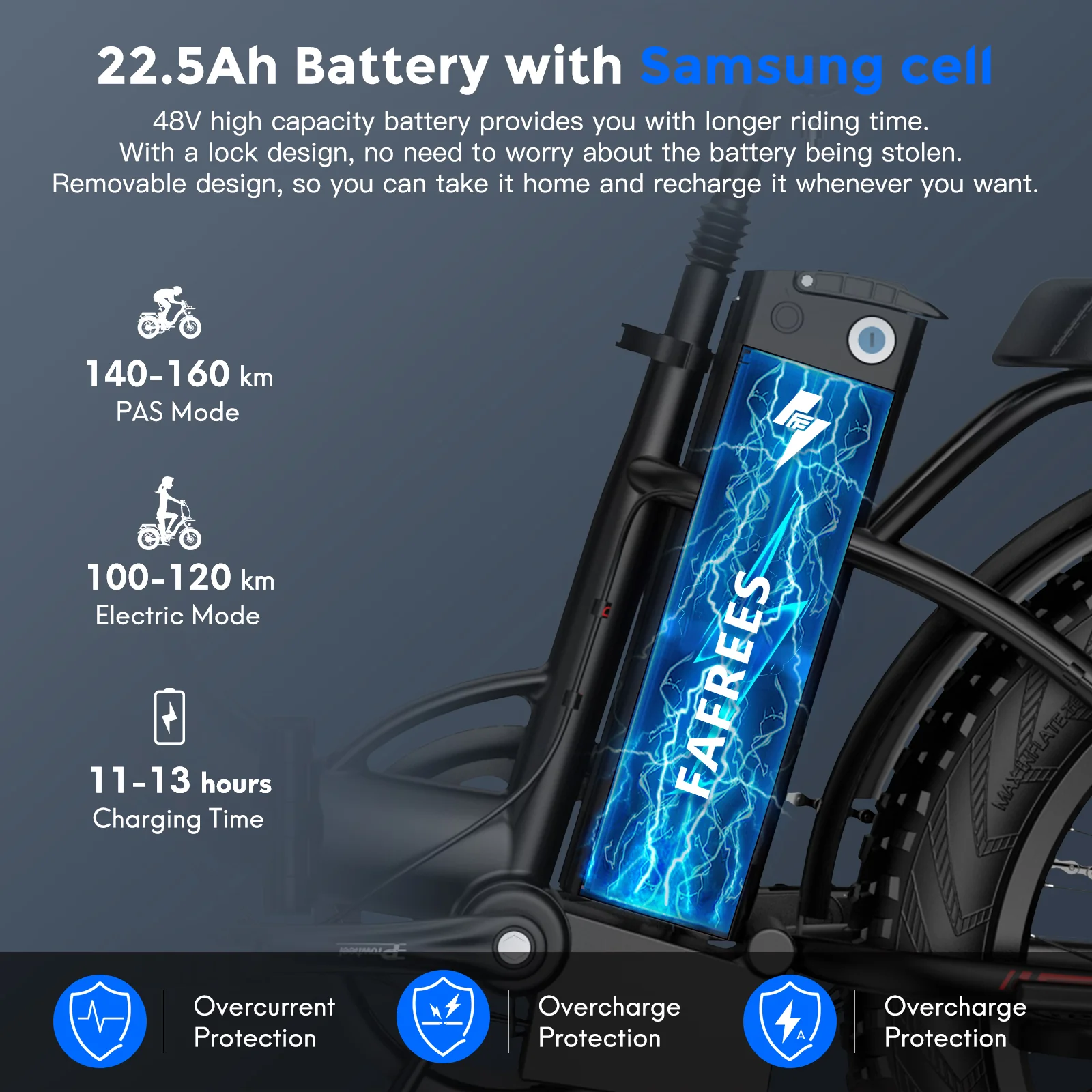 Comes with an advanced Samsung 48V 22.5Ah lithium-ion battery that fully charges in just 11 to 13 hours . With a lockout key, easy to remove and take home to charge, which can last up to 100-120km on a single charge with pure power assistance.