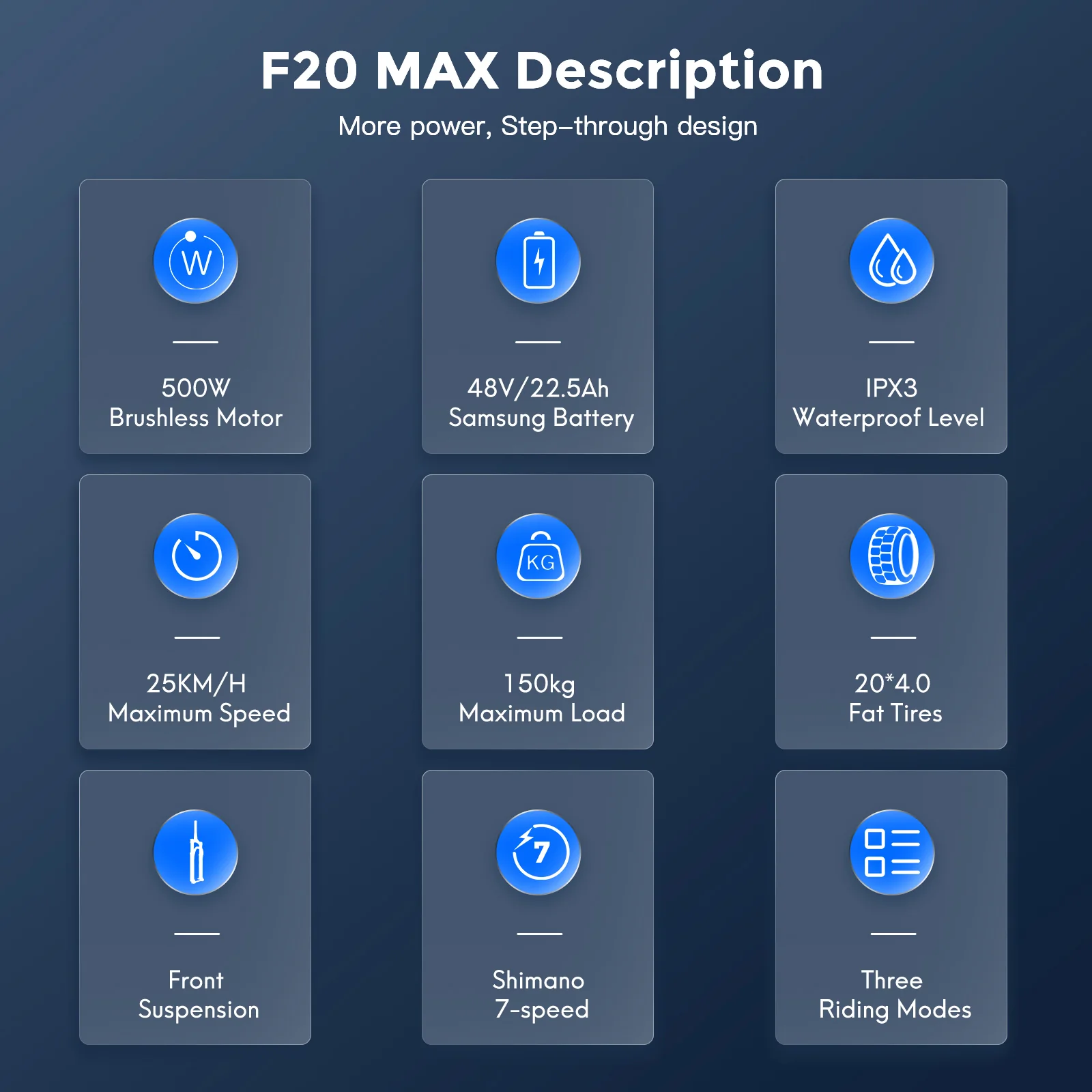| Package included | 1 x Fafrees electric bike F20 MAX 1 x charger 1 x front basket 2 x footrest 1 x tool kit 1x user manual |