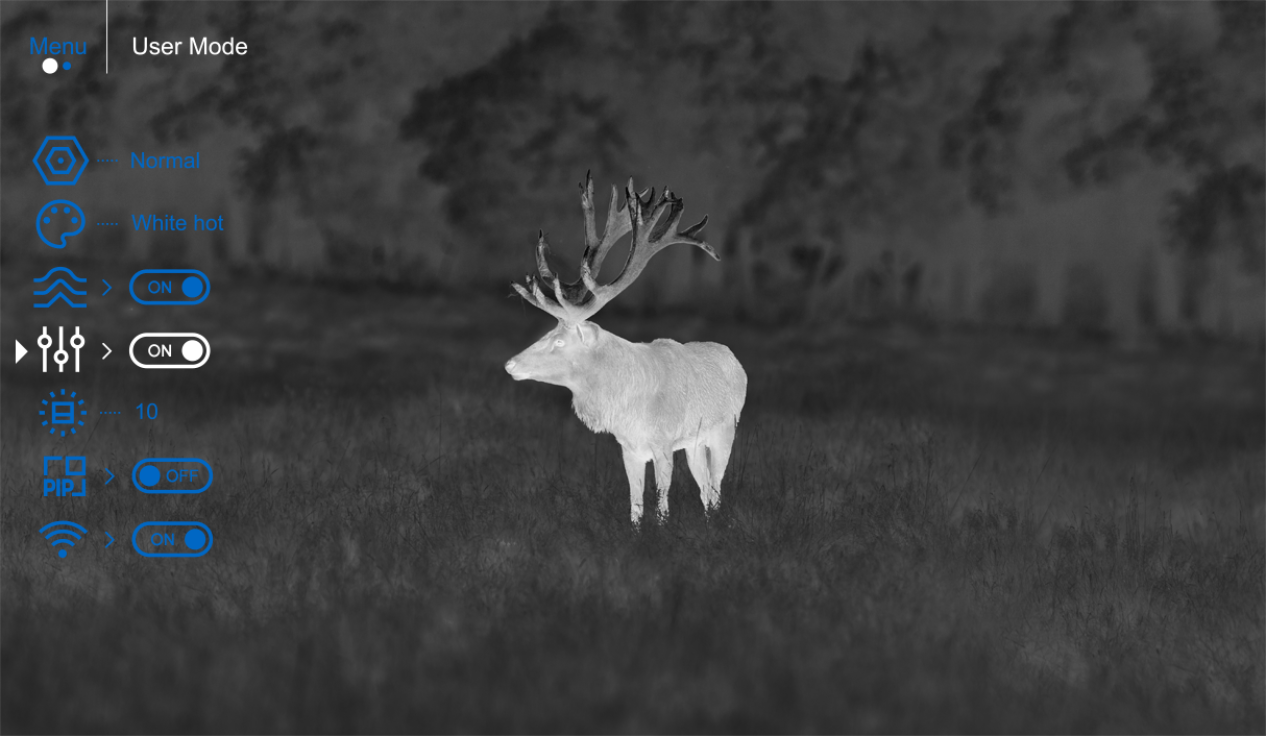 Brightness and contrast settings maximize image detail and informational value under specific viewing conditions. The User Mode feature saves selected brightness and contrast settings in the device's memory, ensuring optimal image quality for immediate future use of the thermal imaging camera without the need for further adjustments.