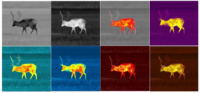 White hot, black hot, and red hot are optimal for detecting objects. Rainbow and ultramarine colors increase the chances of detection and identification. Red monochrome, sepia, and violet are best for longer observations at night.