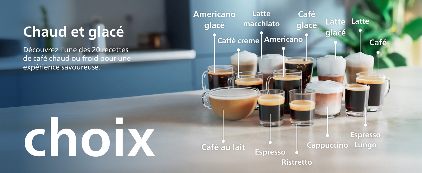 - 20 BOISSONS CHAUDES ET GLACEES : Espresso, Café, Cappuccino, Latte macchiato, Café glacé, Americano, Café crème, Ristretto, Café au lait, Americano glacé, Espresso glacé et plus encore... Avec 22 recettes au choix, vous trouverez votre préparation préférée et bien plus encore !